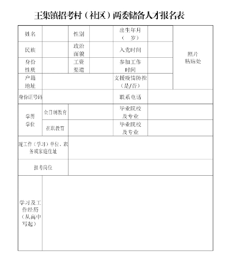 王集镇村(社区)两委储备人才招聘报名表